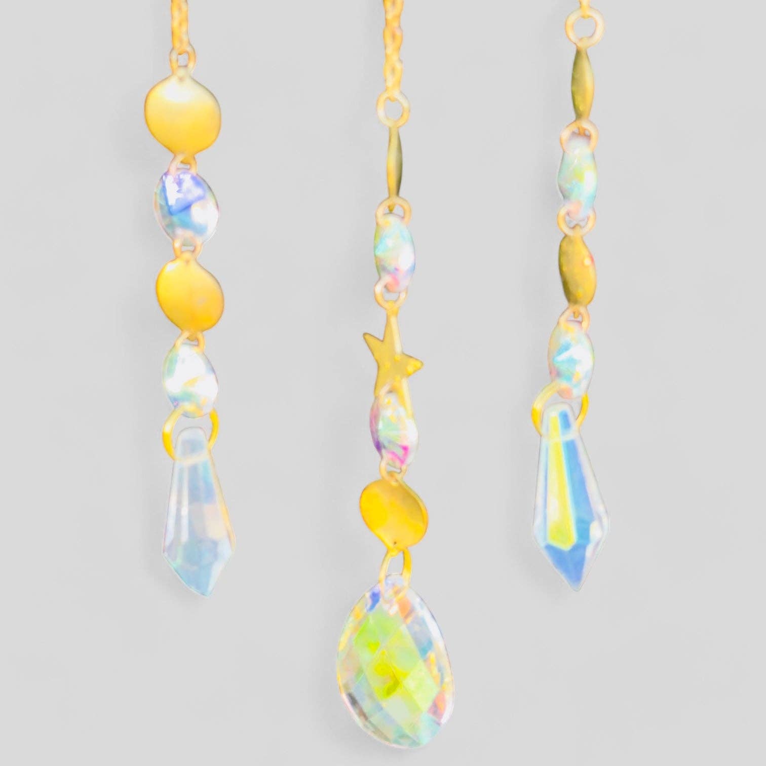 This is an absolutely stunning, handmade dreamcatcher that can be used in your home hanging on the wall or window. It features a crescent moon style with 3 strands hanging from it with prismatic beads and gold accents. Perfect for your home, office, or as a very special gift!