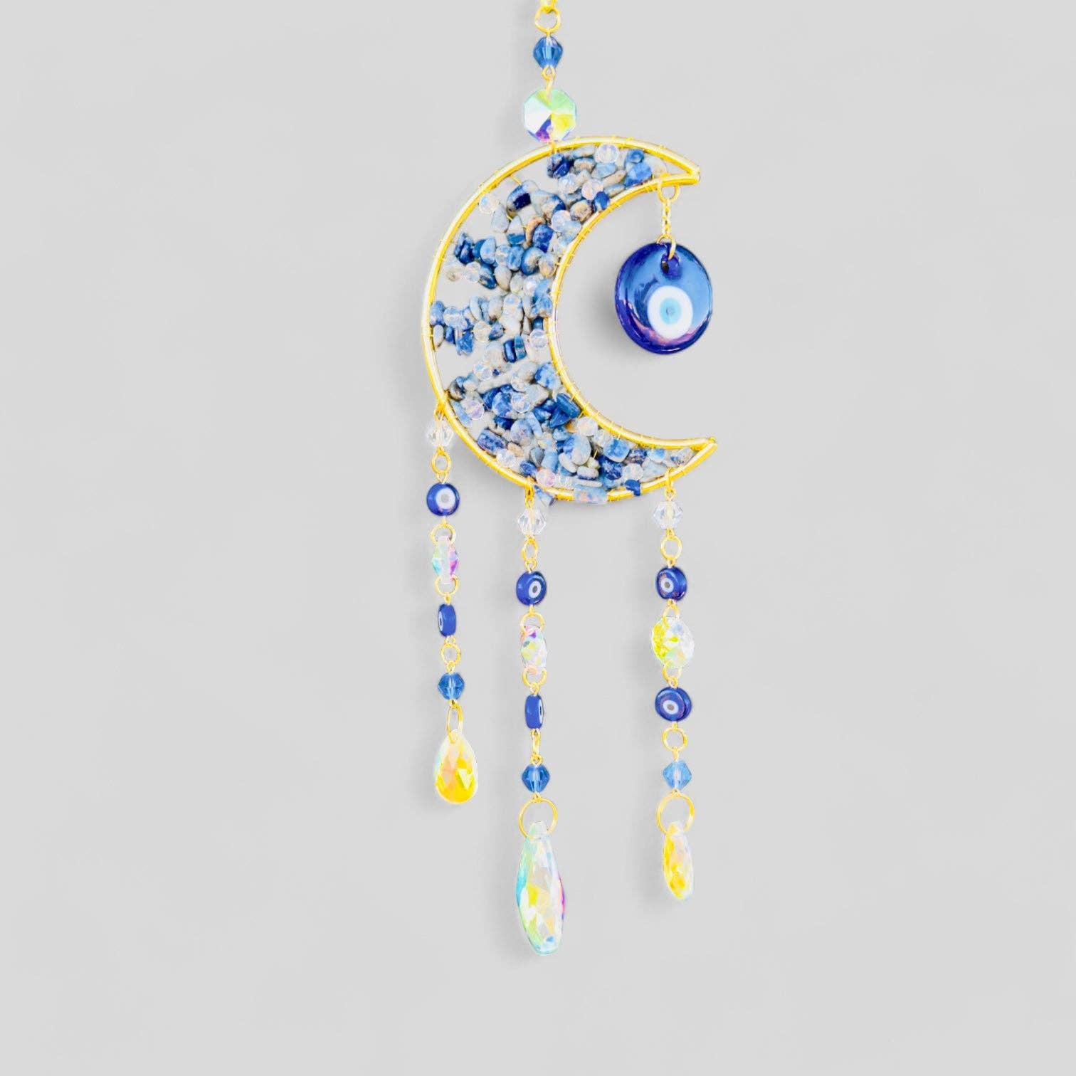 Gold Metal Crescent Moon Dreamcatcher Suncatcher with Hanging Evil Eye Charm and Prisms -- Window Hanging or Wall Hanging