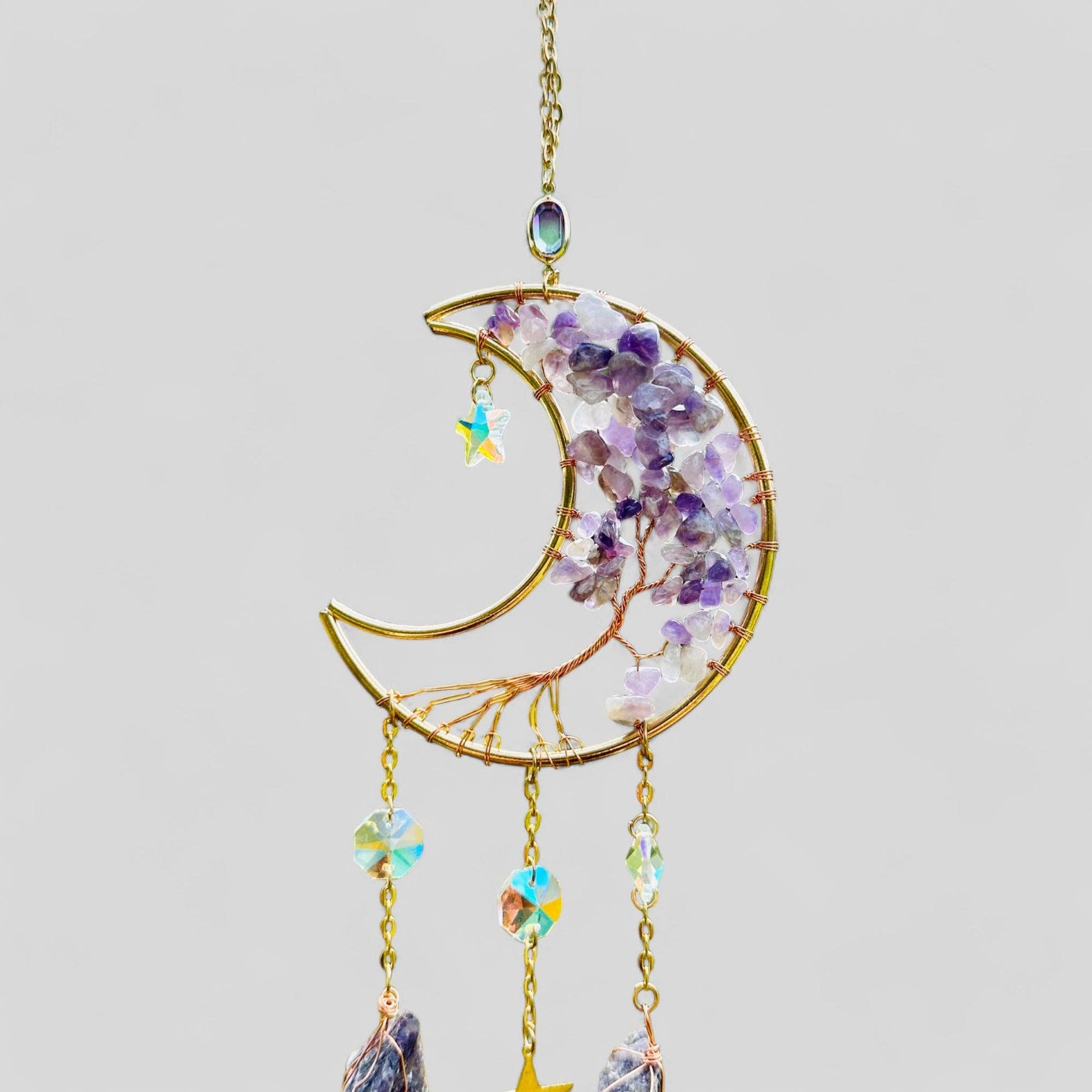 Gold Metal Crescent Moon Dreamcatcher Suncatcher with Tree of Life Amethyst Stones & Hanging Jewel Charms -- Window Hanging or Wall Hanging