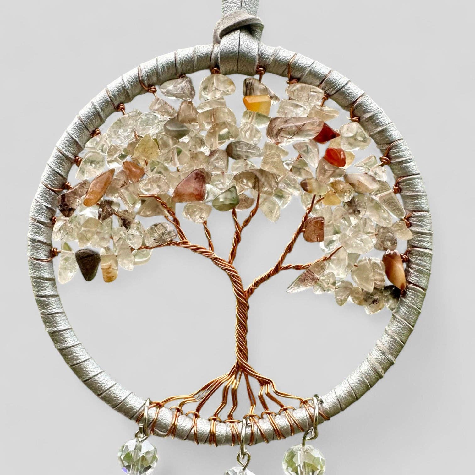 Material: Metal ring covered with silver leather, feathers, natural stones, silver leather hanging cord